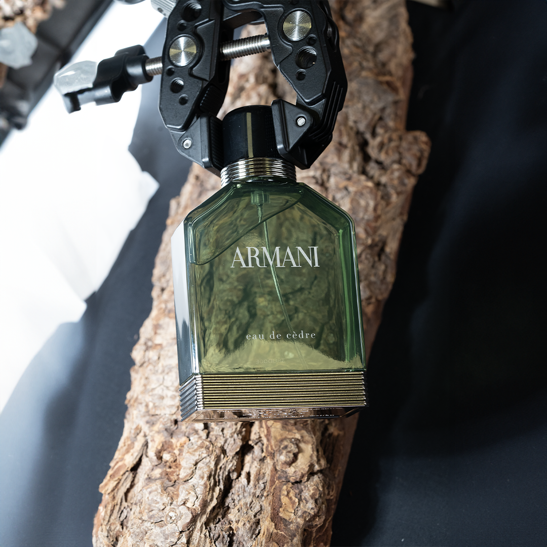 Cette mise en scène évoque une forêt luxuriante et ensoleillée, combinant fraîcheur florale et profondeur boisée, et capture parfaitement l’essence sophistiquée et naturelle du parfum Armani.