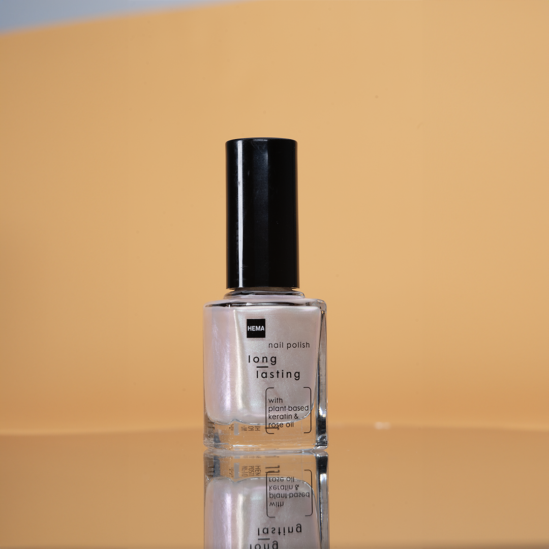 Un flacon de vernis à ongles scintillant aux tons roses se dresse au centre de cette image vibrante.
