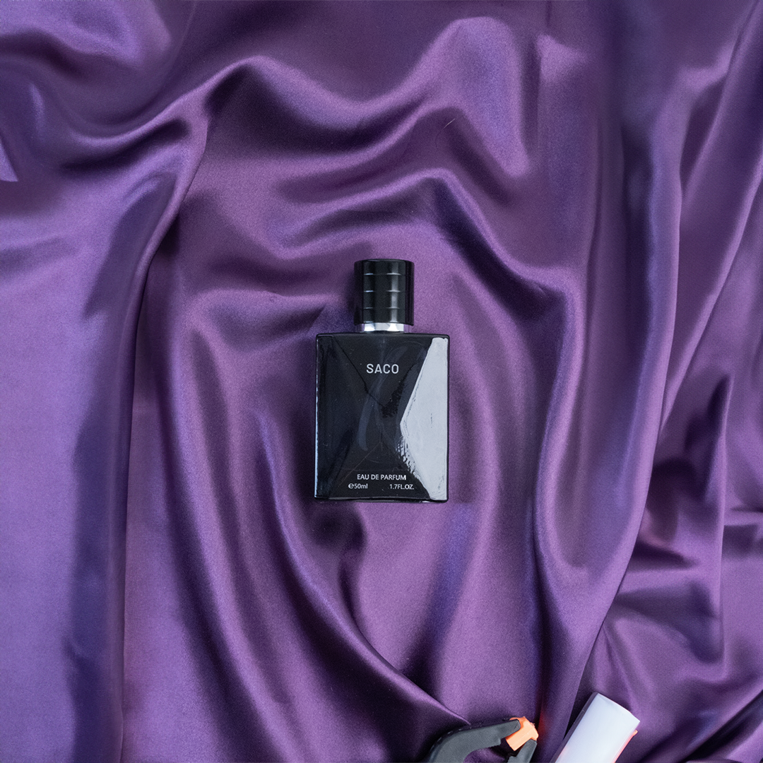 Sur un fond de tissu bleu foncé, mystérieux et profond, le flacon du parfum Saco se trouve magnifiquement mis en valeur.